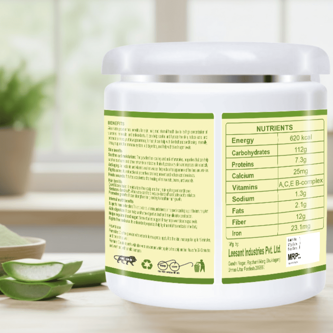 Aloe vera powder is rich in vitamins, minerals, and antioxidants, making it highly beneficial for skin, hair, and overall internal health. It helps soothe and hydrate the skin, reduce acne, and promote youthful-looking skin. For hair, it supports dandruff control and provides natural conditioning. When taken internally, it may help strengthen immunity, improve digestion, and support healthy blood sugar levels.