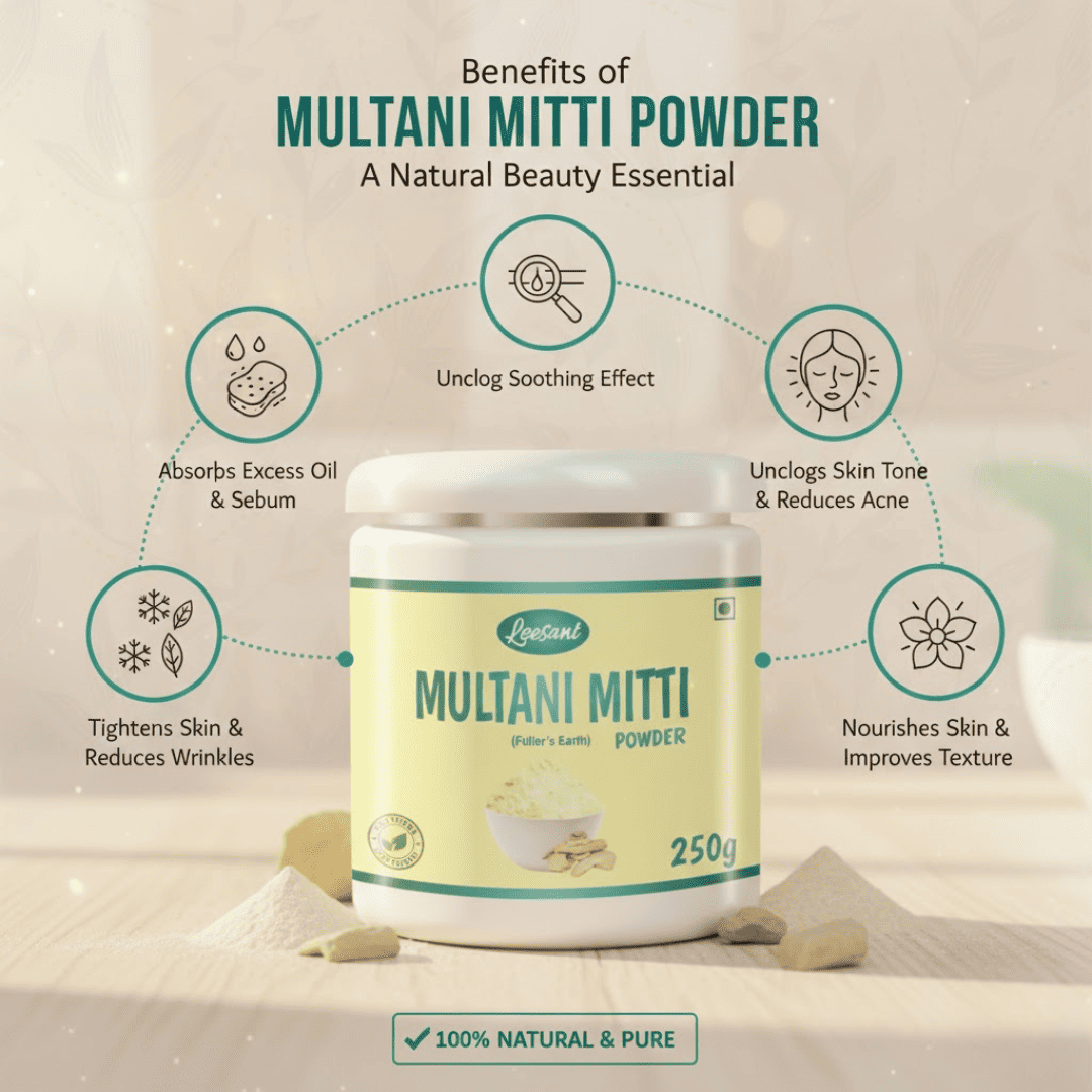 Multani mitti powder provides numerous benefits for both skin and hair due to its natural cleansing, oil-absorbing, and soothing properties. It deeply cleanses the skin, removes impurities, helps treat acne, brightens the complexion, and reduces inflammation. For hair care, it helps control excess oil, cleanses the scalp, and supports healthier, dandruff-free hair.