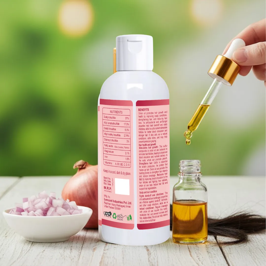 Onion oil promotes hair growth and health by improving scalp conditions, strengthening hair, and reducing hair loss. Its antibacterial and antifungal properties help treat dandruff and scalp infections, while its sulfur content stimulates follicles for better blood circulation and stronger hair. It also acts as a natural conditioner, adds shine, and may help prevent premature graying.