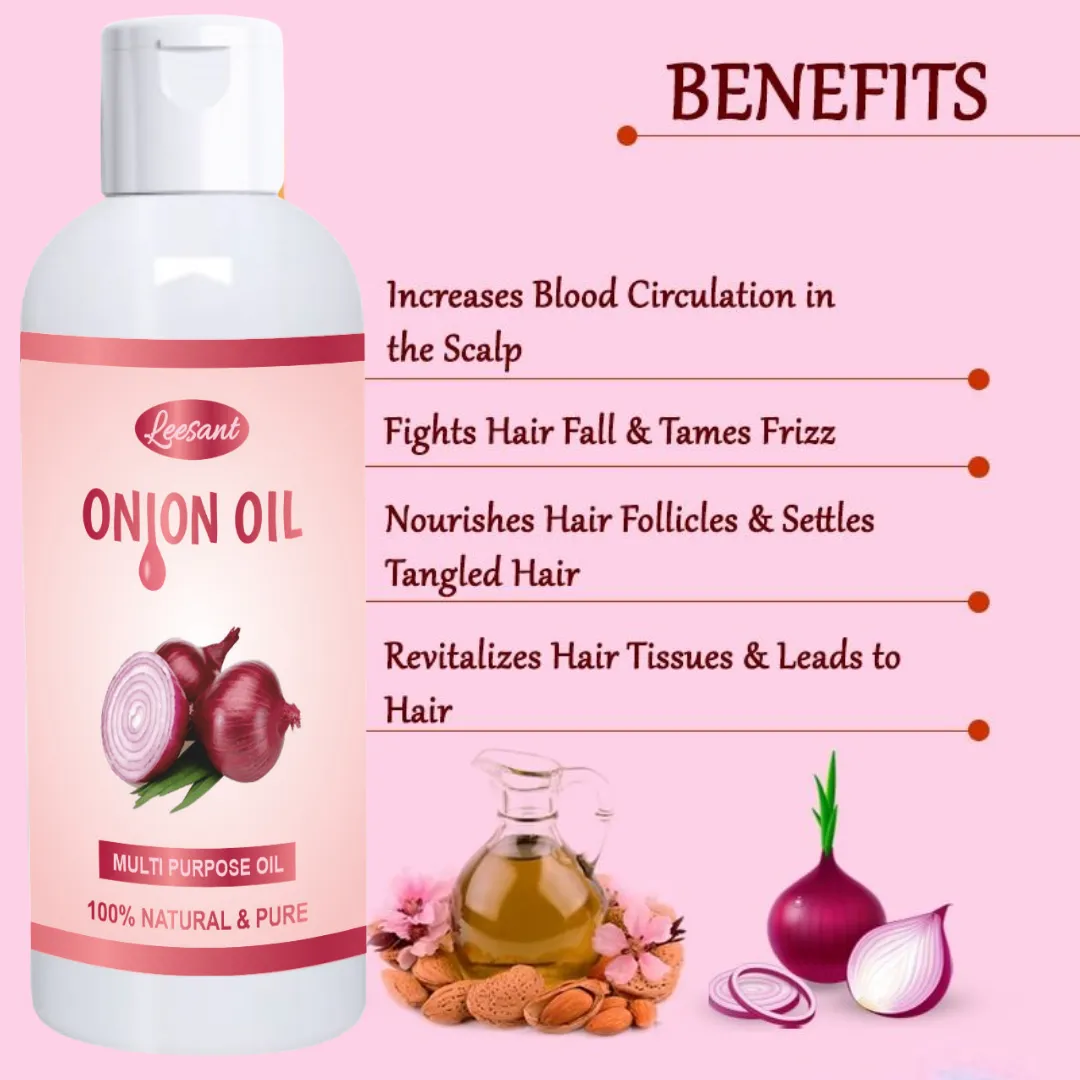 - Reduces Hair Fall: By improving blood circulation to the hair follicles and fighting free radicals, onion oil can help reduce hair fall and support hair regeneration.